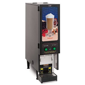 This Bunn FMD 2 BLK Fresh Mix cappuccino espresso dispenser has a colorful lighted mug display and two 4 lb. hoppers. The cappuccino espresso machine s variable speed hopper motors give you complete control over the ratio of powdered mix to hot water inside the mixing chambers so you can adjust for different types of products. The Bunn FM